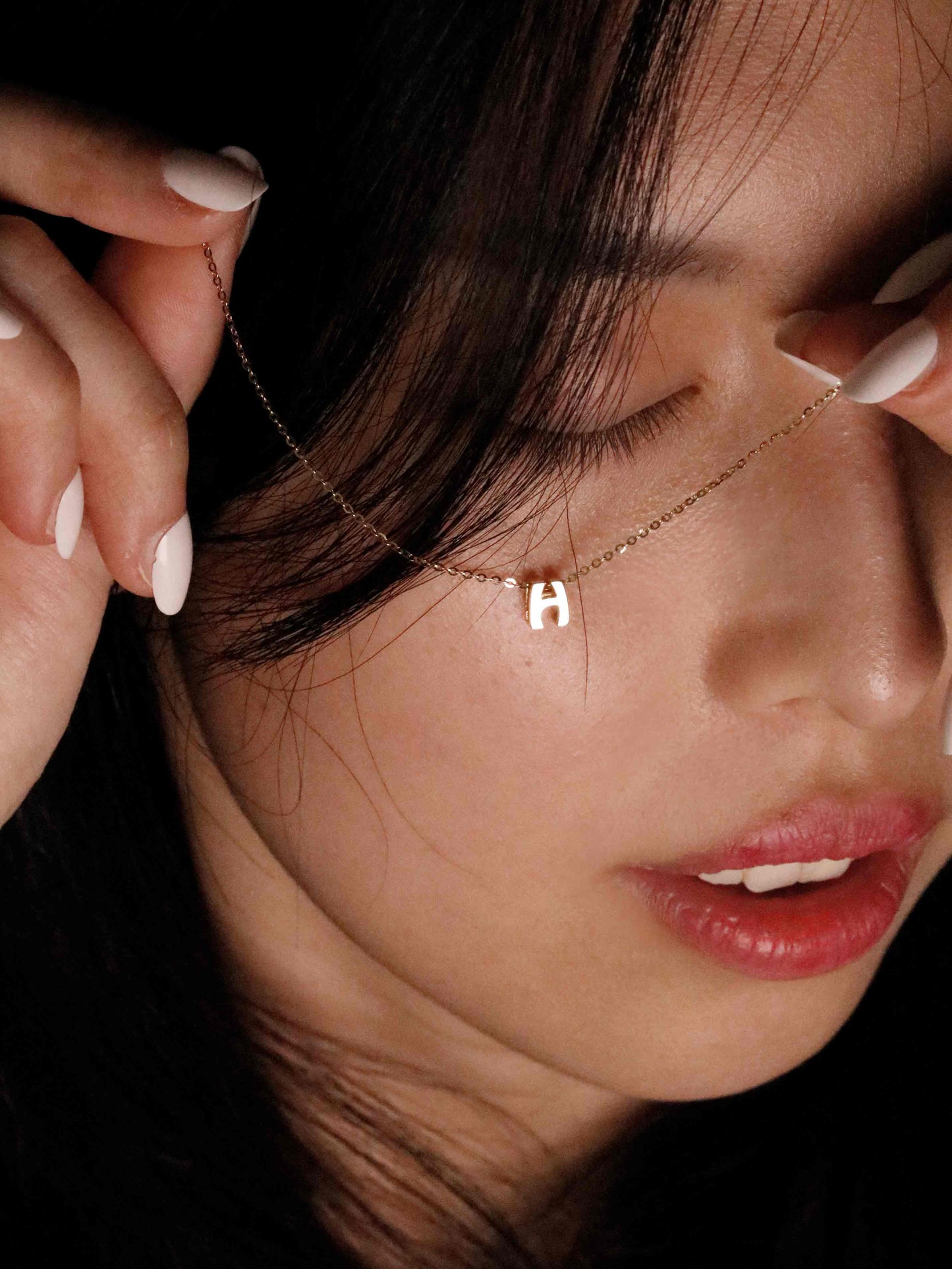 Hands holding a bracelet with a 'H' pendant against a black background